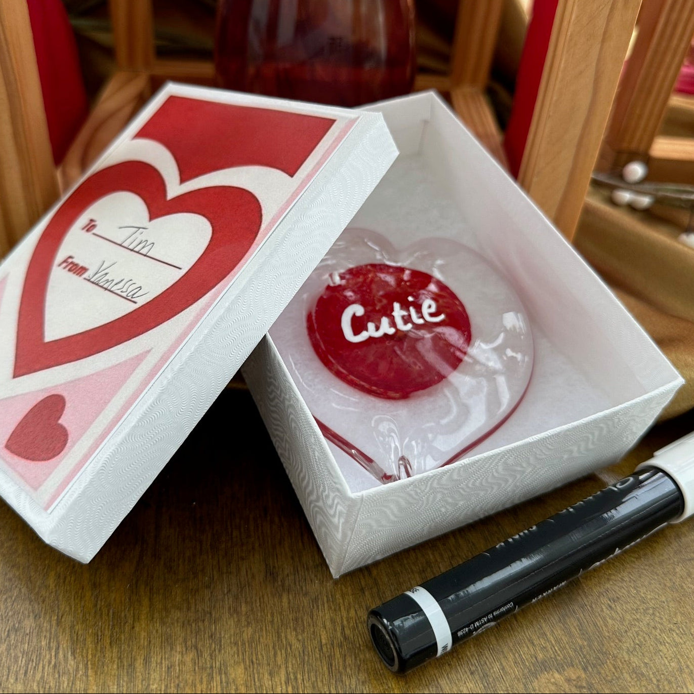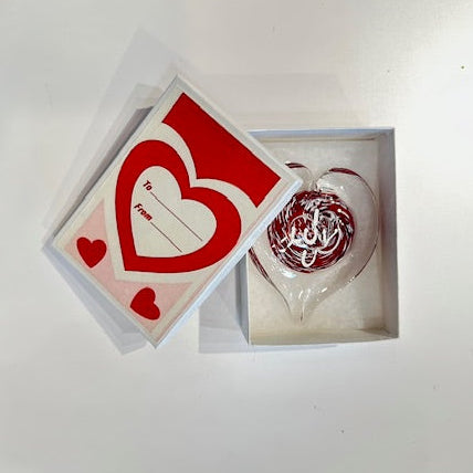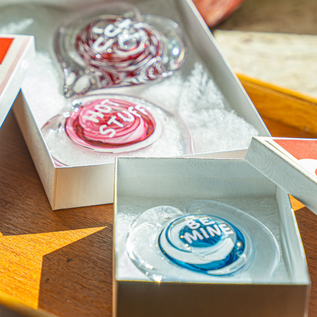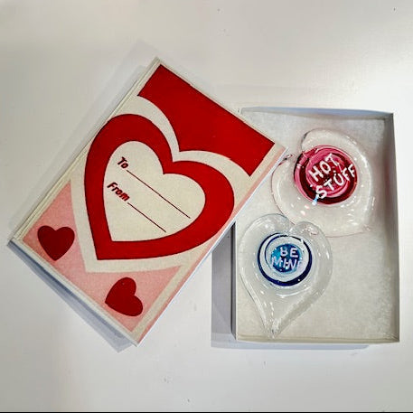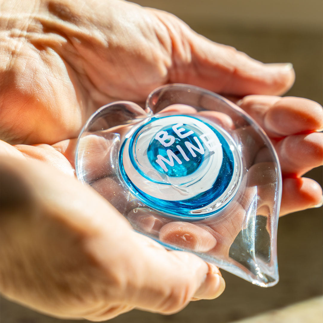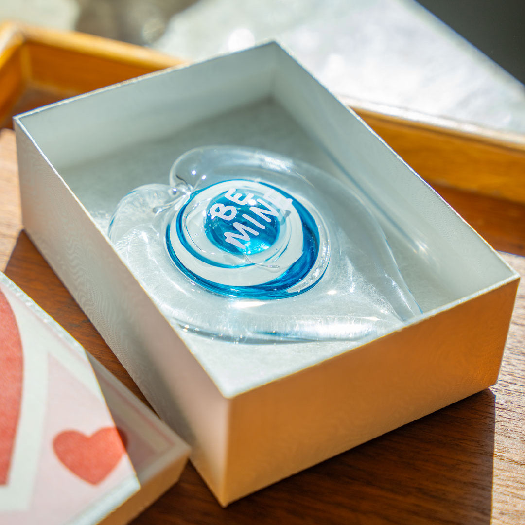 Include your message in the text box when ordering to let us know what you'd like your heart to say. We'll write your 2-3 word message with chalk pen onto the glass, and enclose your gift in a Conversation Heart Box. Your message can be changed using a chalk pen any time you want to say something special.